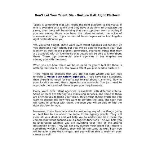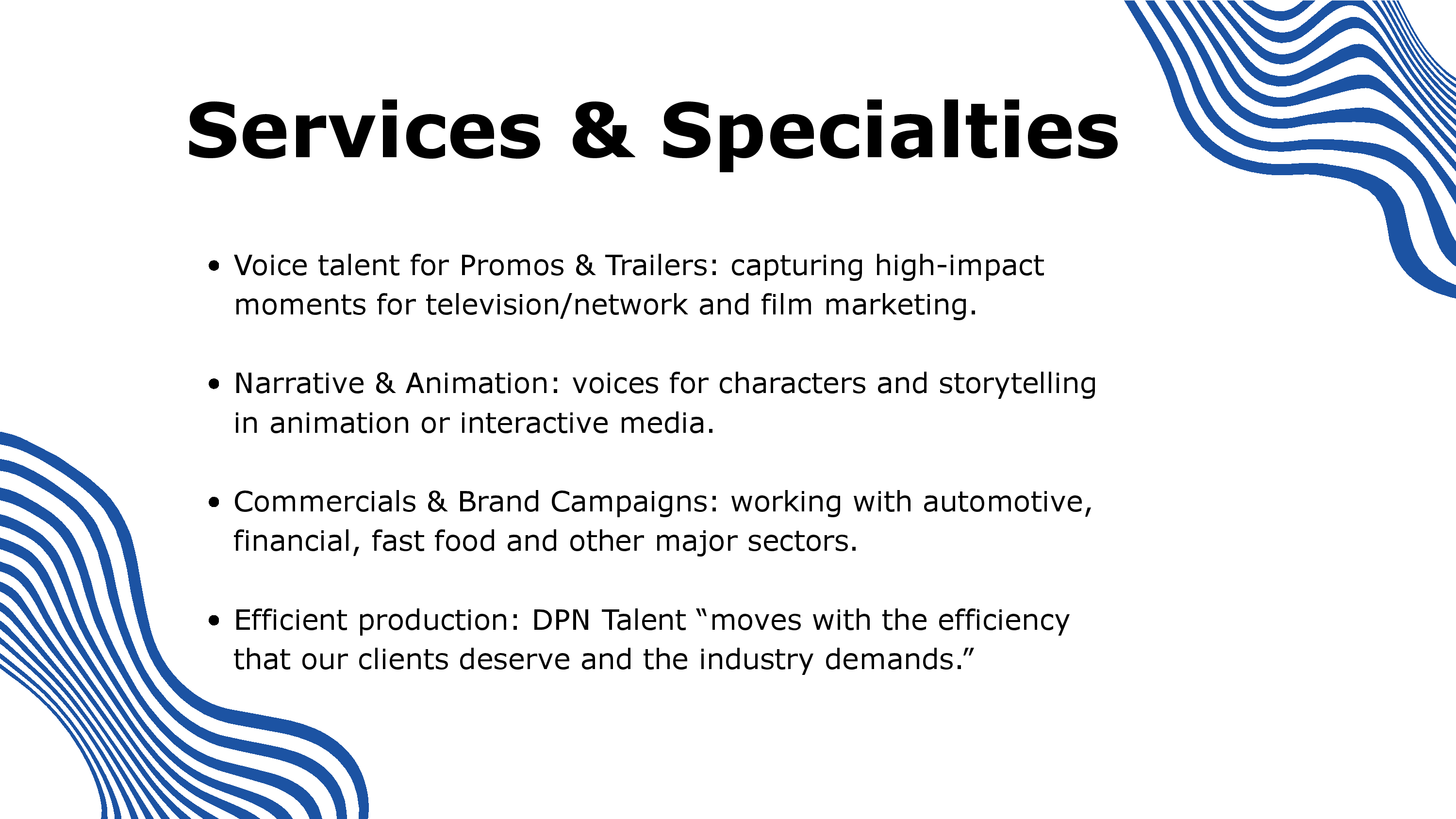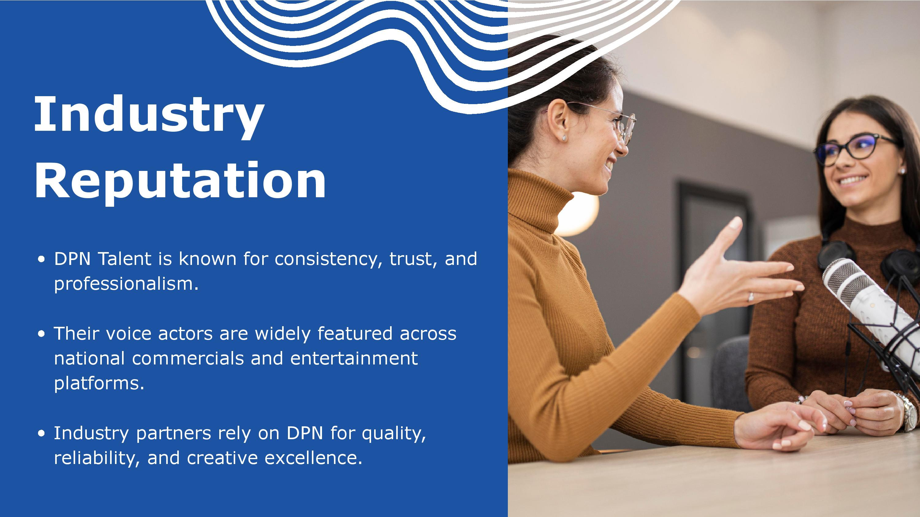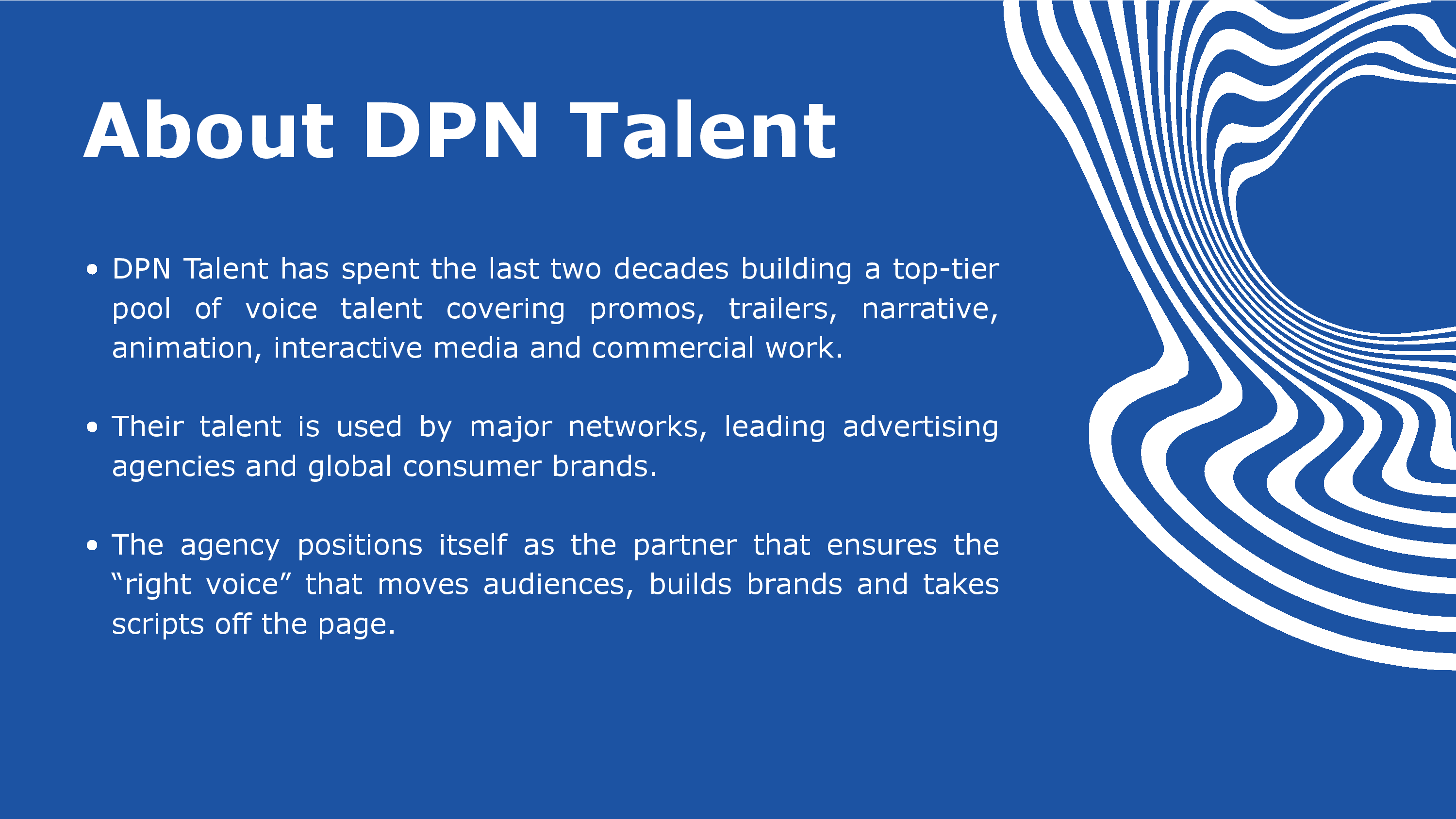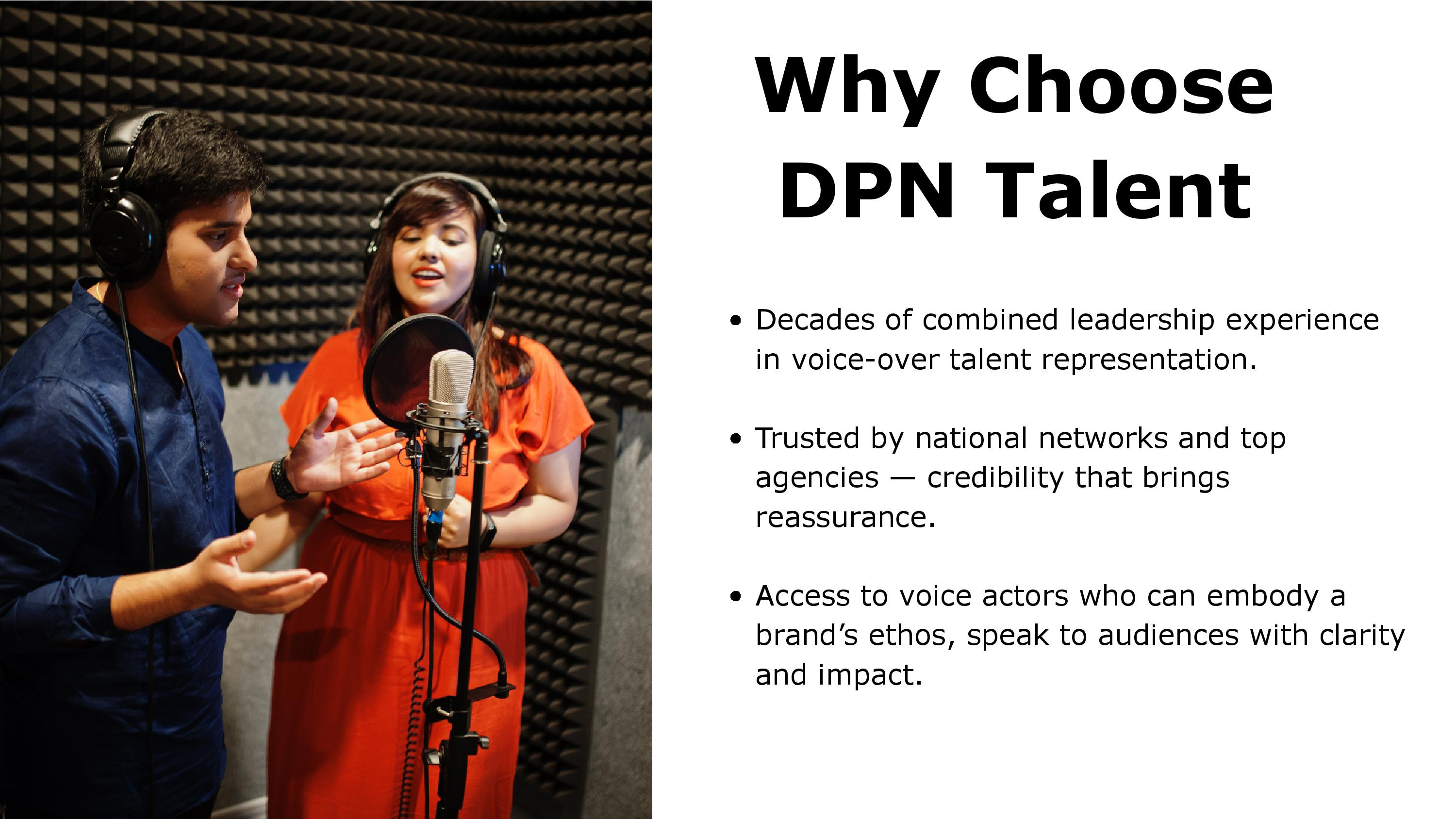 DPN Talent is a premier talent agency, representing the most sought-after talent in the industry. We have many smooth, adaptable and professional voice over agents with excellent talent, that can help bring your project to life! Listen to some of the