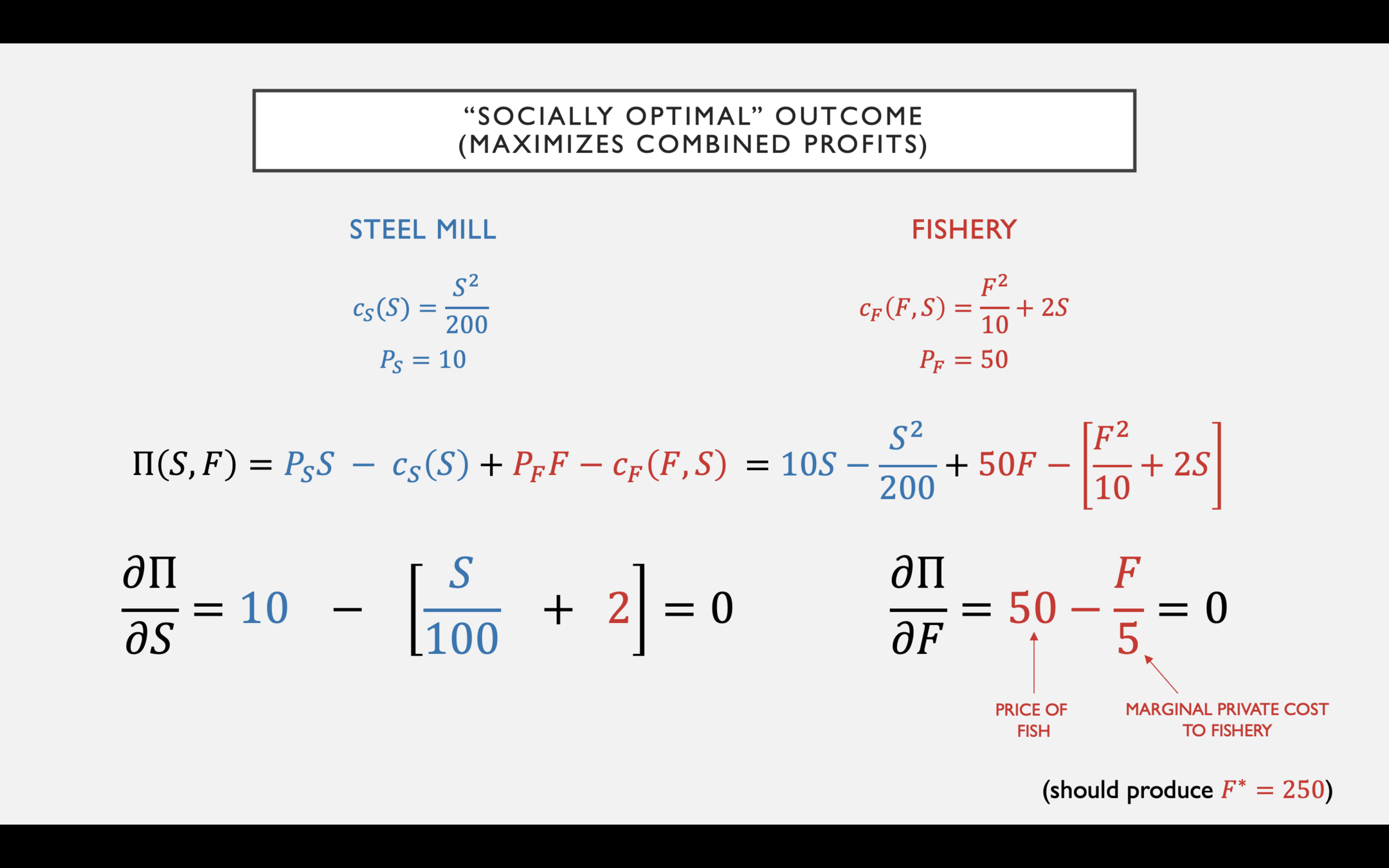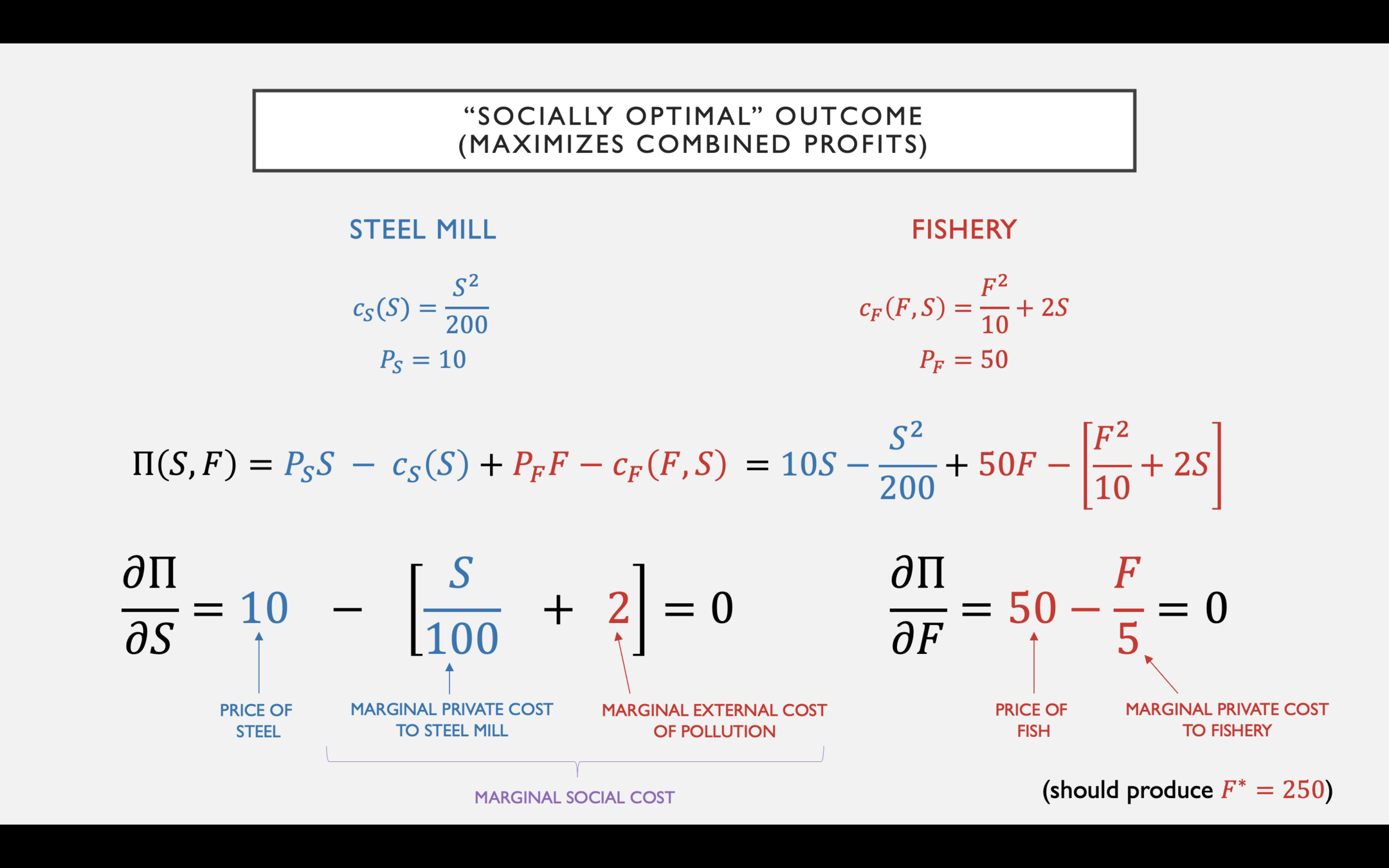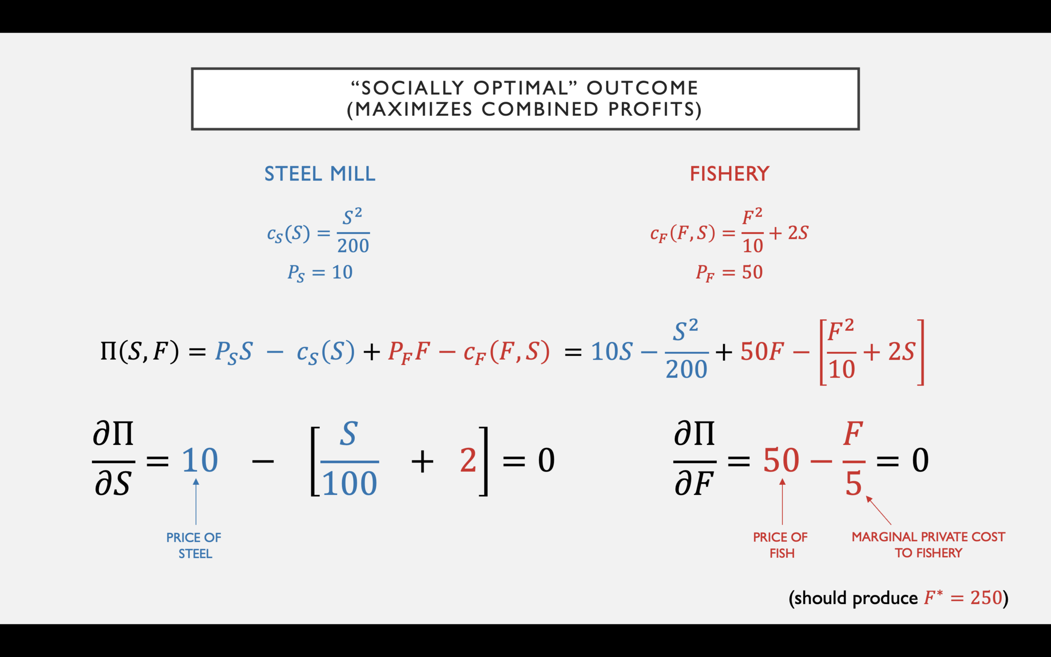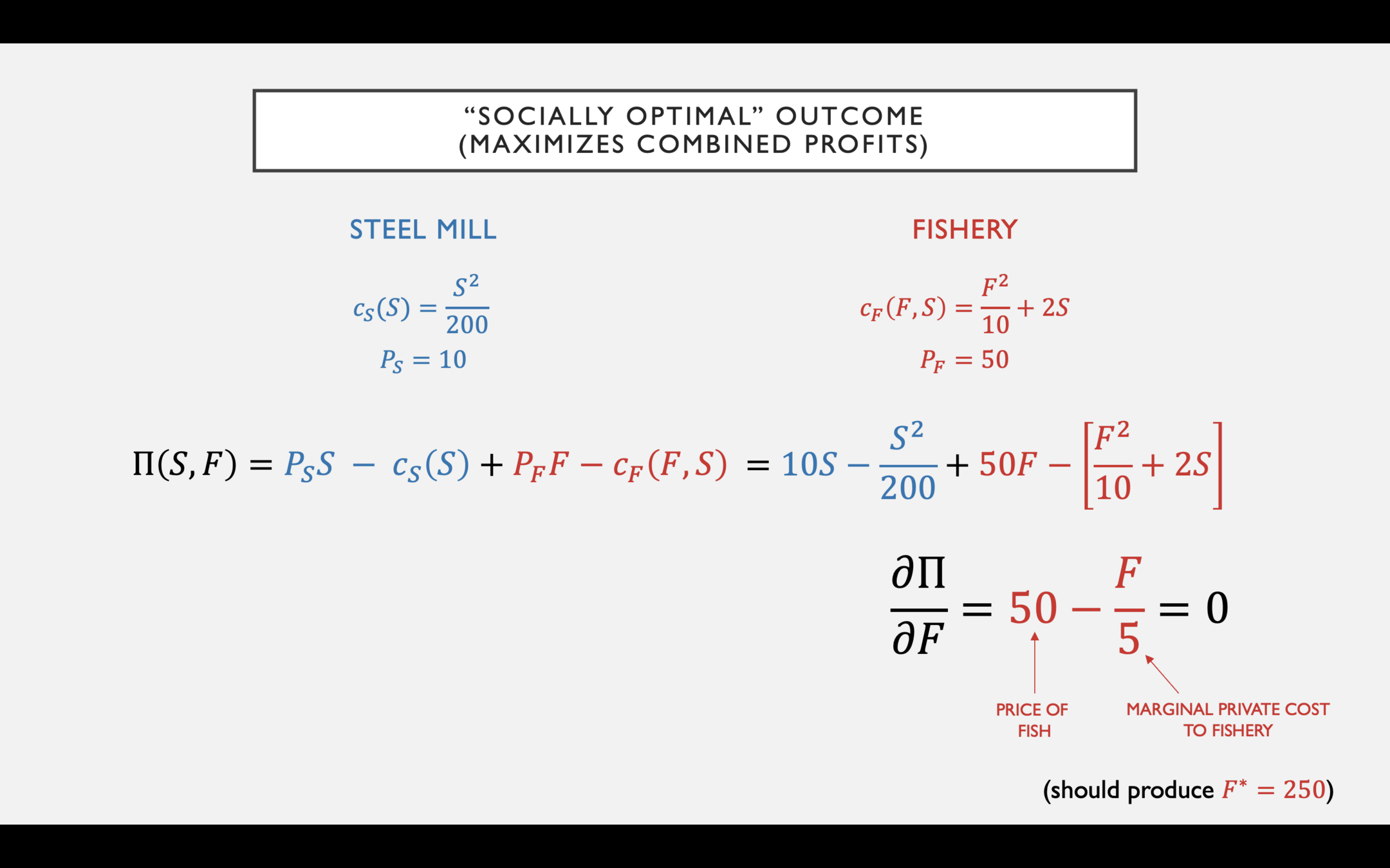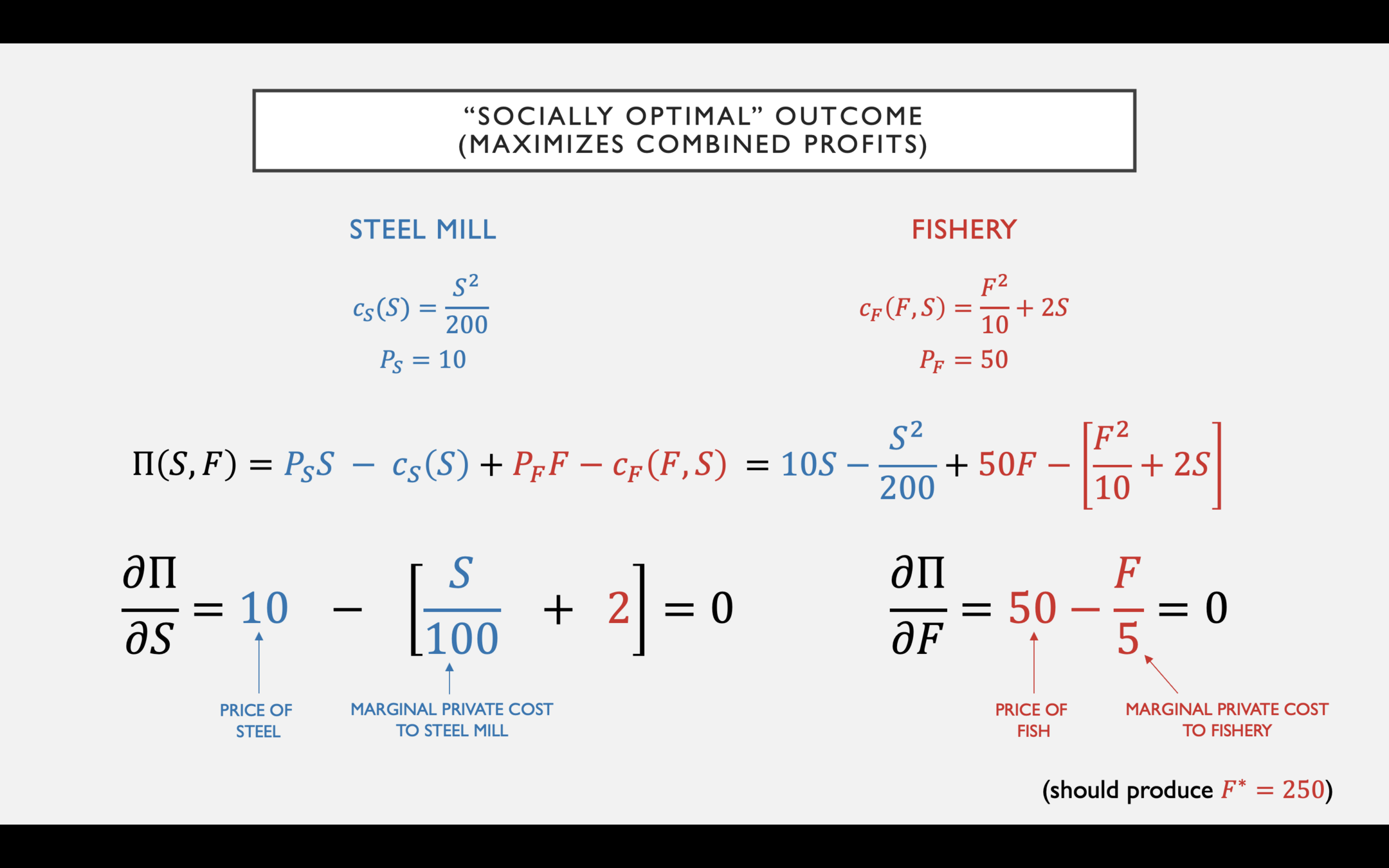 Ronald Coase's insight: we can achieve the optimal quantity via negotiation if we assign property rights to the firms.