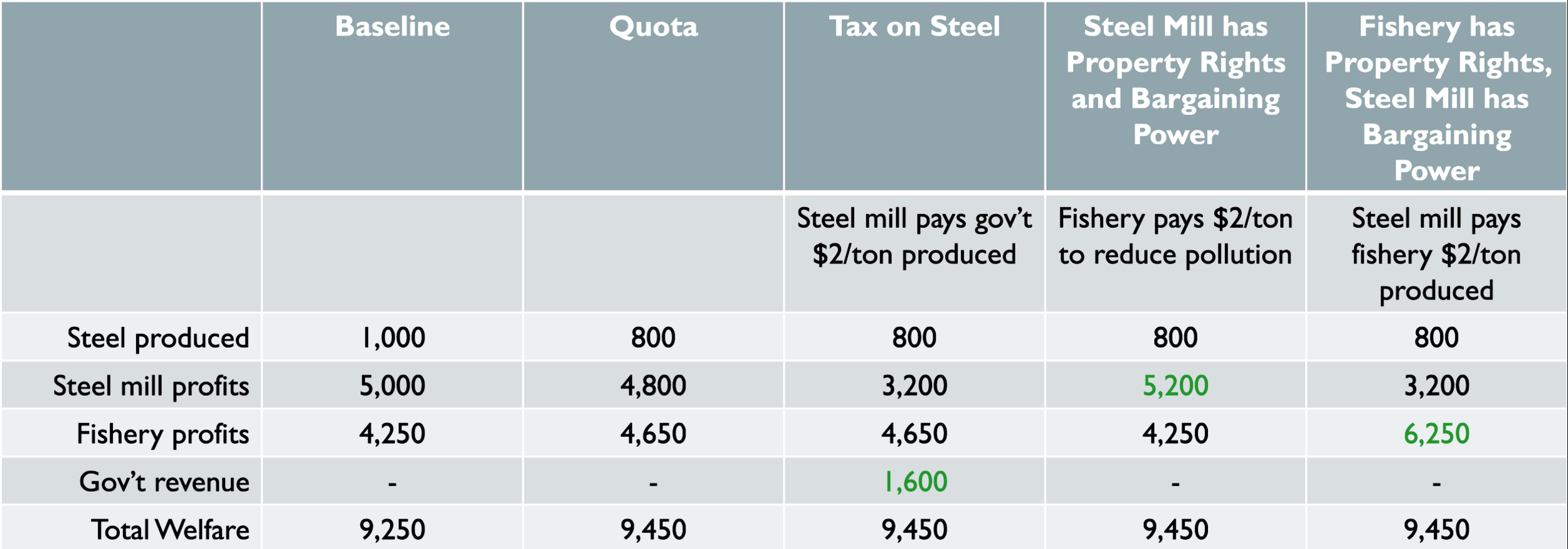 - Give the steel mill the "right to pollute" and let the fishery pay them to not pollute.