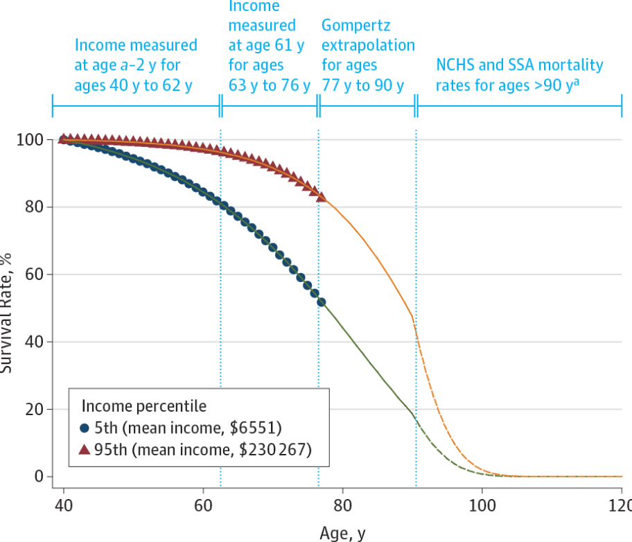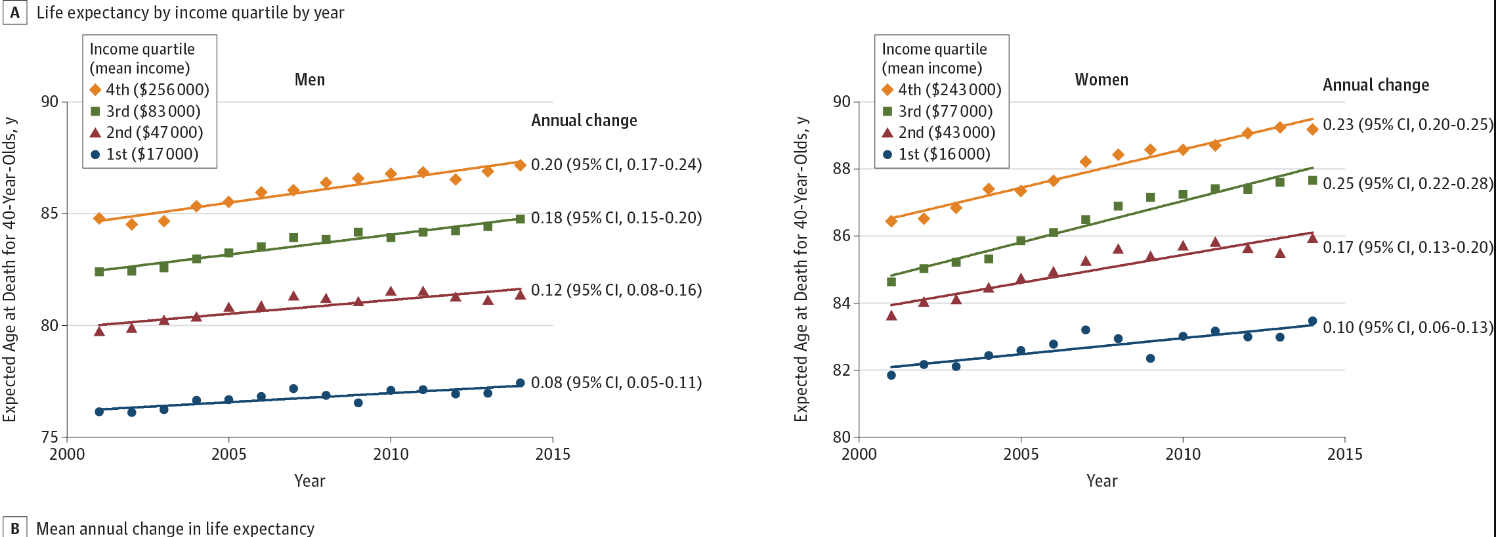 Chetty et al 2016 shows that over time, high earners and low earners are experiencing health outcomes that are increasingly unequal.