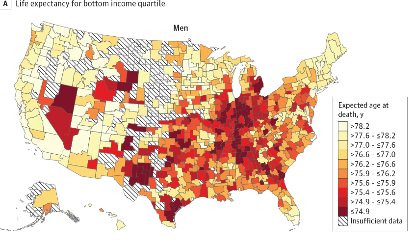 Some places particularly bad for low income individuals -- what is correlated with low life expectancy among low income?