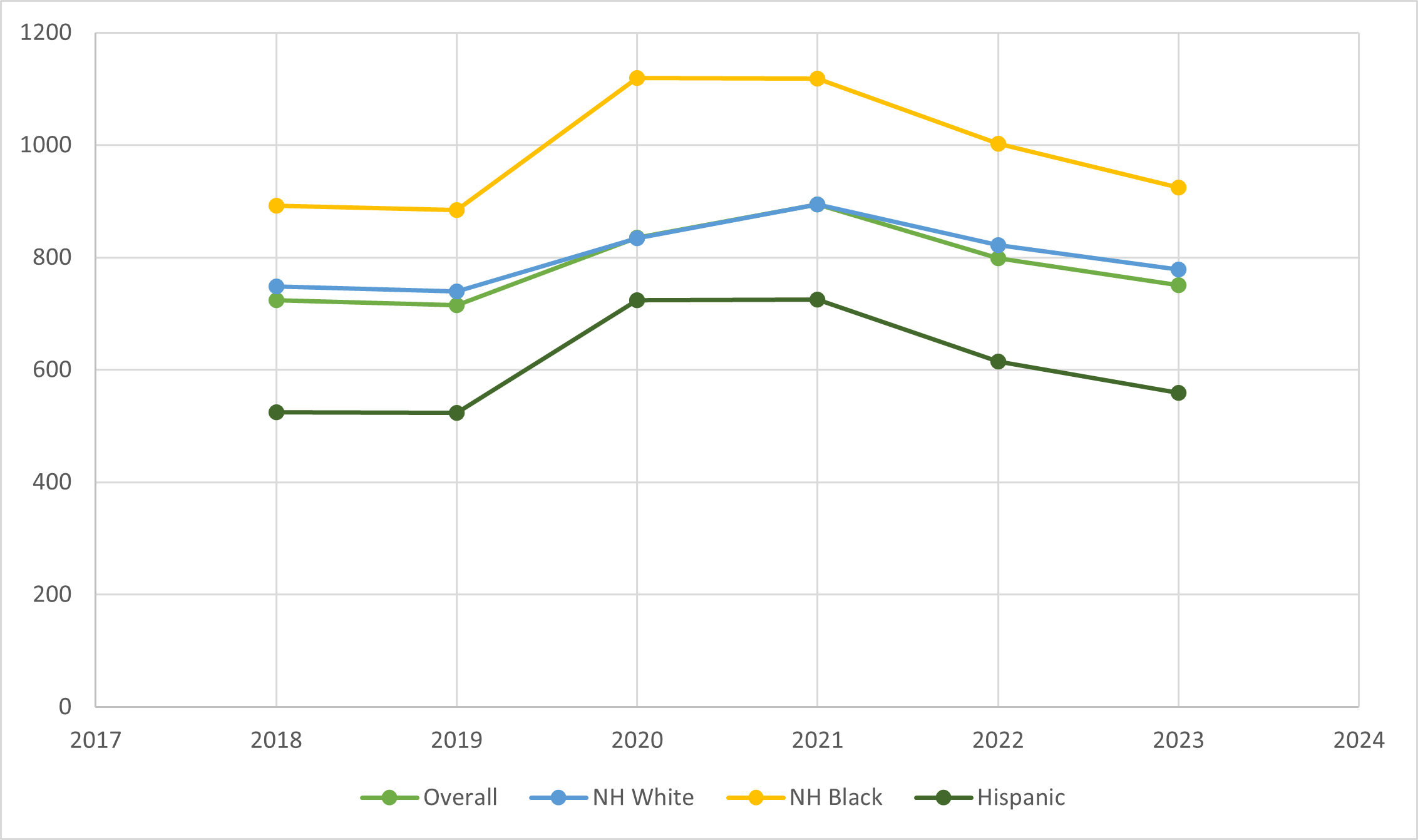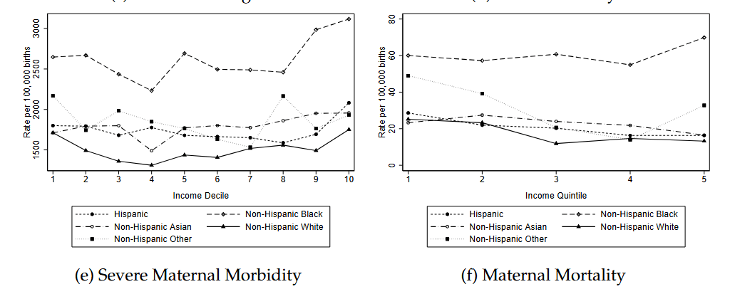 Much higher mortality rates for non-Hispanic Black vs non-Hispanic white or Hispanic (although some convergence in recent years)