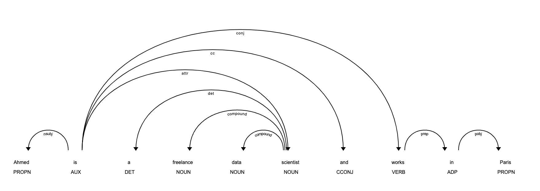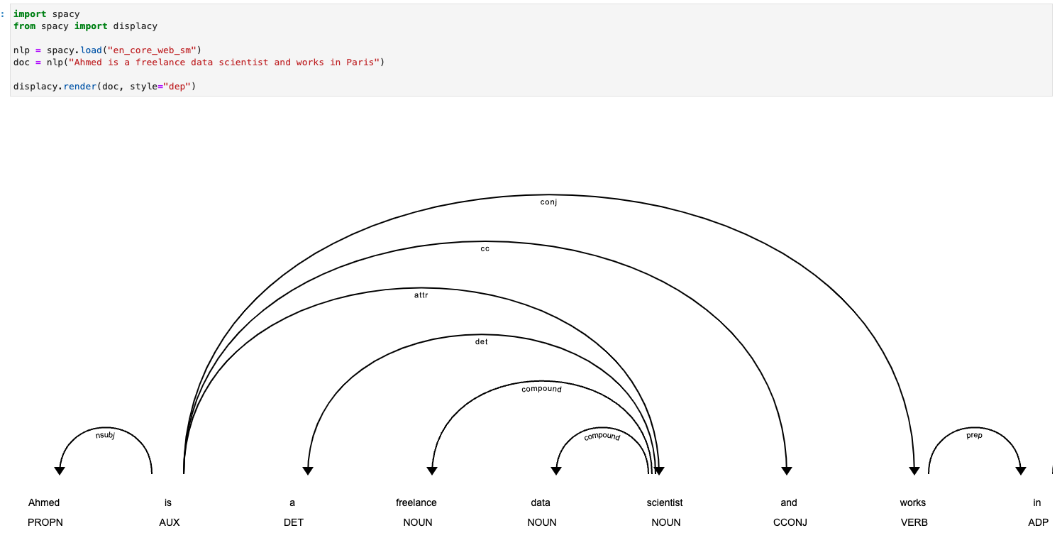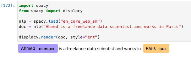 doc = nlp("Ahmed is a freelance data scientist and works in Paris")